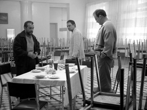 Absurd situations abound, however, during the 24 hours that the film covers. The three men are old school-friends who are now in their midlife crisis. Speranskii feels inferior to his successful wife Olga; Tolian is a womanizer, with at least three ex-wives; and Zema who has nothing and nobody. These now 40-year-old men built the plans for their future in the late 1980s during perestroika. Feldman acquired a professional training as doctor and has a decent income; Speranskii is a painter, supported financially by his wife; Zema has no work and no place to live, and is a social outcast, who sleeps on benches in the park. Only Orlov, who has terminal cancer, has done really well: he is a factory boss. He helps others, such as the mad Sasha whom he has set up in the boiler-house, or the paralyzed Garik in a wheelchair. While Orlov helps the poorer classmates, Zema, Speranskii and Feldman have not been able to provide support for others. Not for Ania, Feldman’s ex wife, who attempted suicide and had a miscarriage; not for Garik; not for Boria, with the suicidal Stepa and an empty flat; nor for the mad Sasha.