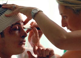 puts in a lot of research before coming up with an injury application. “The secret of a convincing make-up job is not to have the colourisation